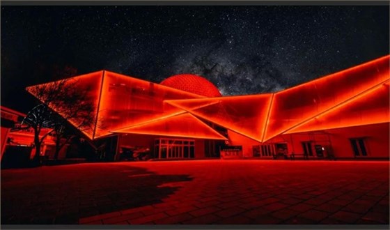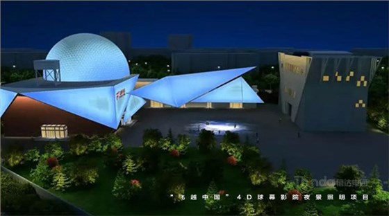 在光色的設(shè)計(jì)中,信達(dá)電通采用皓白、暖黃、科技藍(lán)等多種顏色漸變切換的設(shè)計(jì)手法。燈光重點(diǎn)勾繪外圍建筑輪廓,突出建筑的獨(dú)特結(jié)構(gòu),與球幕影院和廣場(chǎng)地面的投影形成互補(bǔ)和諧的夜景畫面。