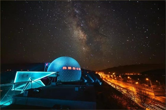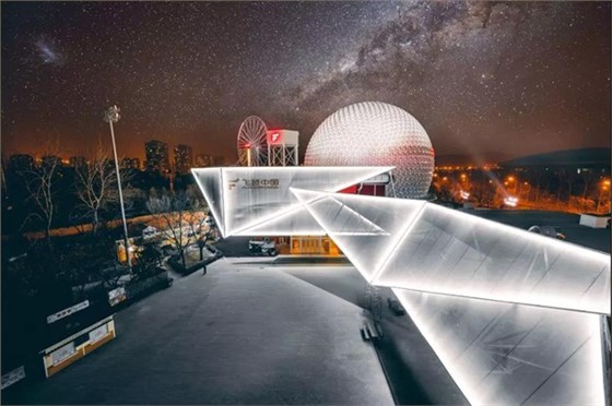 影院高32.8米,總占地總面積3600平方米。外觀的球形頂,代表著神秘浩瀚的宇宙和閃爍星空,神秘又等待著探索。外圍建筑狀似飛翼,采用的是鋼絲膜強(qiáng)化來建筑造型,展現(xiàn)建筑“飛躍”之勢(shì),正與“飛越中國”這一主題相契合!