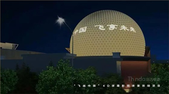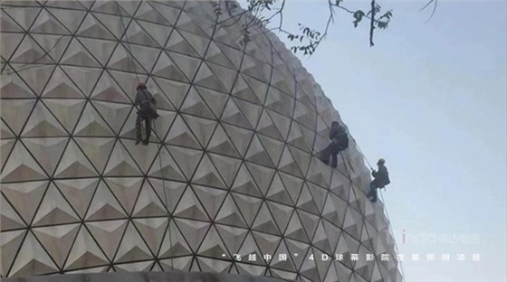 隨著球幕外立面光色切換,“我愛你中國”、“飛覽天下飛越中國”等主題字幕滾動(dòng)播出。為實(shí)現(xiàn)預(yù)期的設(shè)計(jì)效果,信達(dá)團(tuán)隊(duì)多次夜間試燈。