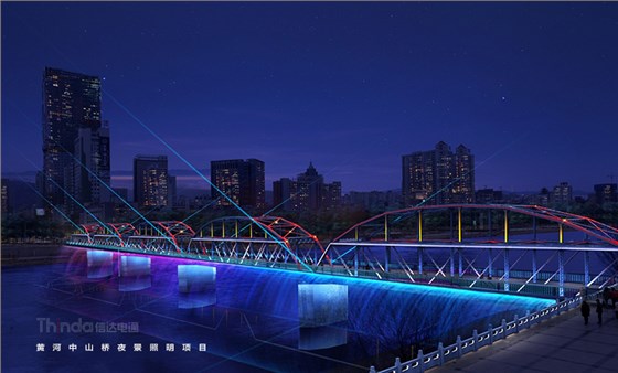 蘭州中山橋歷史悠久,建于清光緒年間,素有“天下黃河第一橋”之稱,全長234米,寬7.5米。信達(dá)電通邀請橋梁建筑設(shè)計師和信達(dá)照明設(shè)計師聯(lián)合主筆,暖黃光和藍(lán)光為主色調(diào),形成和諧夜景氛圍,既滿足夜間基礎(chǔ)照明照度,又通過燈光渲染將大橋體量在夜間凸顯,重拾大橋風(fēng)度。