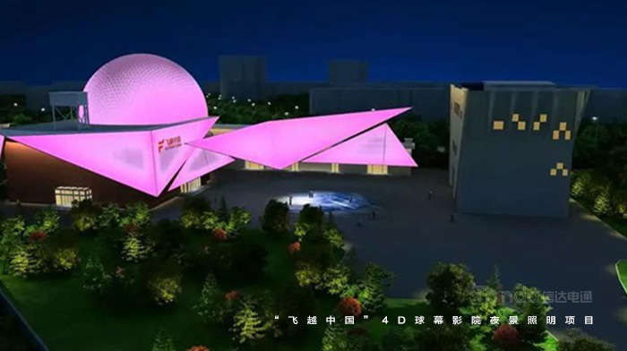 在光色的設(shè)計中,信達電通采用皓白、暖黃、科技藍等多種顏色漸變切換的設(shè)計手法。燈光重點勾繪外圍建筑輪廓,突出建筑的獨特結(jié)構(gòu),與球幕影院和廣場地面的投影形成互補和諧的夜景畫面。
