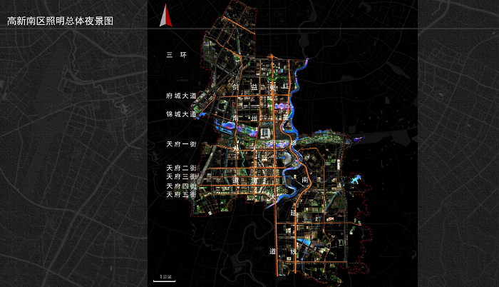 高新南區(qū)以天府大道為中軸線(xiàn),形成一軸、兩帶、四縱、八橫、多核的照明結(jié)構(gòu)。