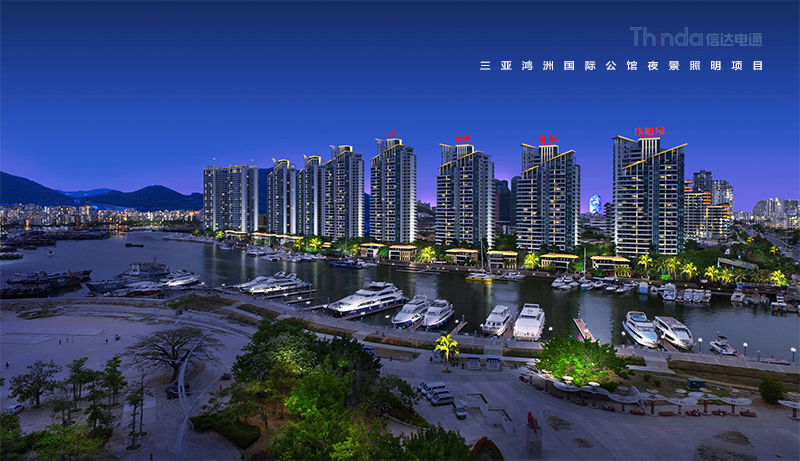 在設計之初,信達夜景照明設計師,將三亞鴻洲國際公館夜景照明效果放在了三亞時代海岸東岸整體的夜景照明規(guī)劃中考慮,三亞鴻洲國際公館夜景照明的目標應與三亞時代海岸東岸夜景照明的整體目標相一致,讓業(yè)主理解到其夜景照明不是奢華性投入,也不是簡單的“亮化”,應該符合三亞時代海岸的夜景照明“提升旅游、服務旅游”的目標宗旨和鴻洲國際的商業(yè)服務性質。根據三亞鴻洲國際的建筑造型,信達電通確定了以展示獨特“V”形建筑立面為主要表現點,信達電通在展示建筑外立面的獨特美感同時,也烘托出了三亞鴻洲國際的文化,使三亞鴻洲國際在整個三亞時代海岸顯得溫馨,靜雅。